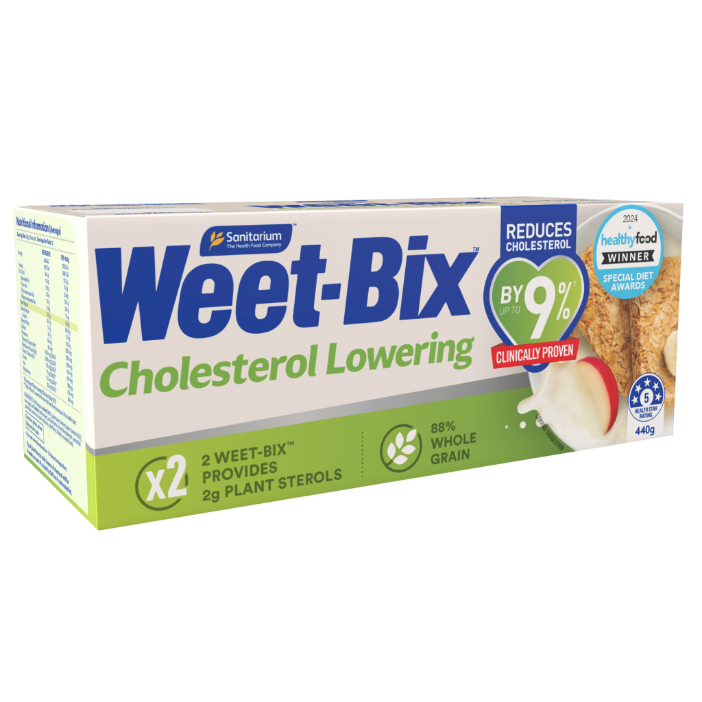 One serve of Weet-Bix™ Cholesterol Lowering (2 wheat biscuits) packs enough plant sterols to help cut LDL (bad) cholesterol by up to 9% in just four weeks – as proven in clinical trials—when enjoyed daily as part of a healthy, low–saturated fat diet.